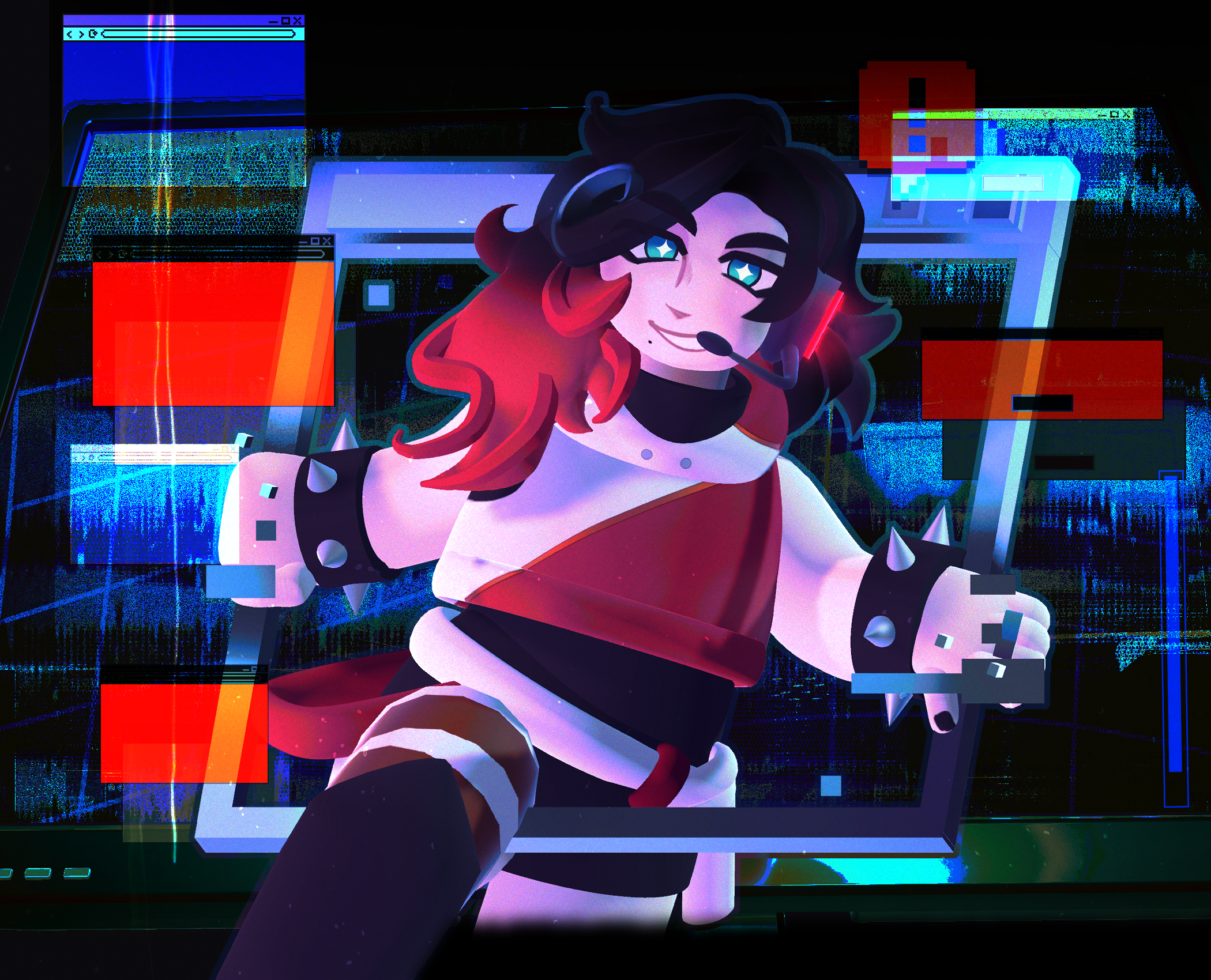Loud when they wanna be, but lazy— somehow with a pep in their step. Irone aka is a sentient virtual assistant created by a super futuristic tech company, chromocorp. Singing is one of their favorite things to do- when they're not sneaking off for a nap, of course. They love teasing their friends, annoying the living sh- telling funny jokes and. pomegranates. oh this they/them loves pomegranates. Even while goofing off, they still seem to be able to belt their heart out- and help you with whatever menial chores or tasks you ask them to do. Need a little charm in your collection of virtual assistants? add irone aka to your repertoire!